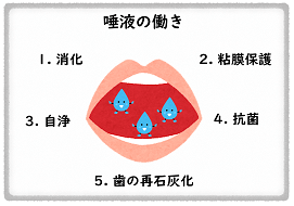 - 殺菌作用: 唾液に含まれる成分が細菌の増殖を抑える