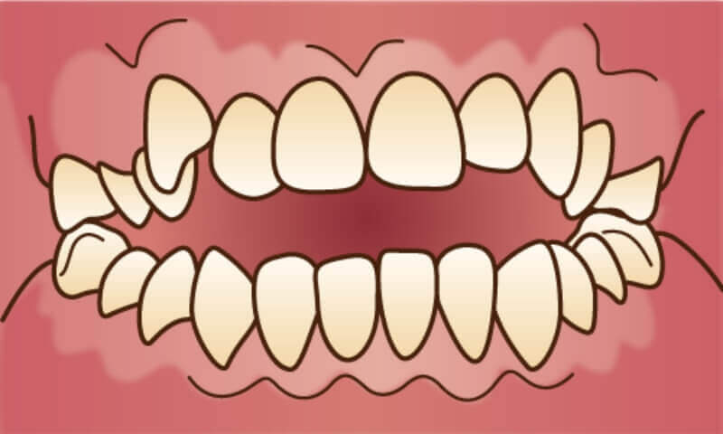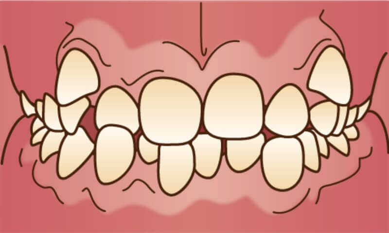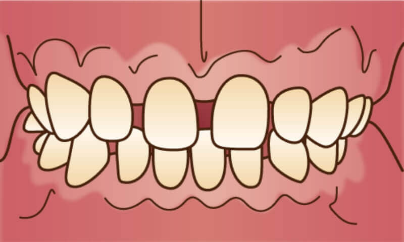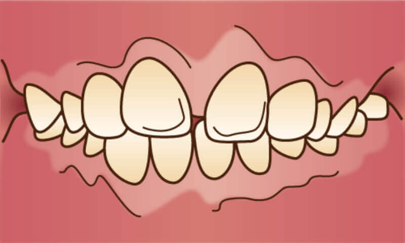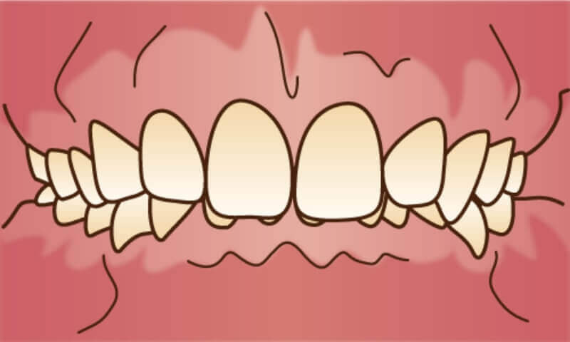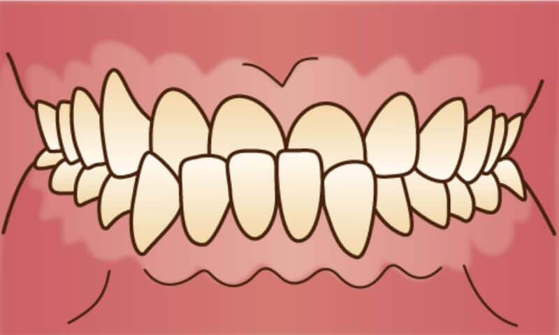 歯が重なってバラバラに生えている状態です。叢生は日本人に多く、八重歯も叢生の一種と言えます。ブラッシングの難しさから、虫歯や歯周病のリスクが特に高い不正咬合です。